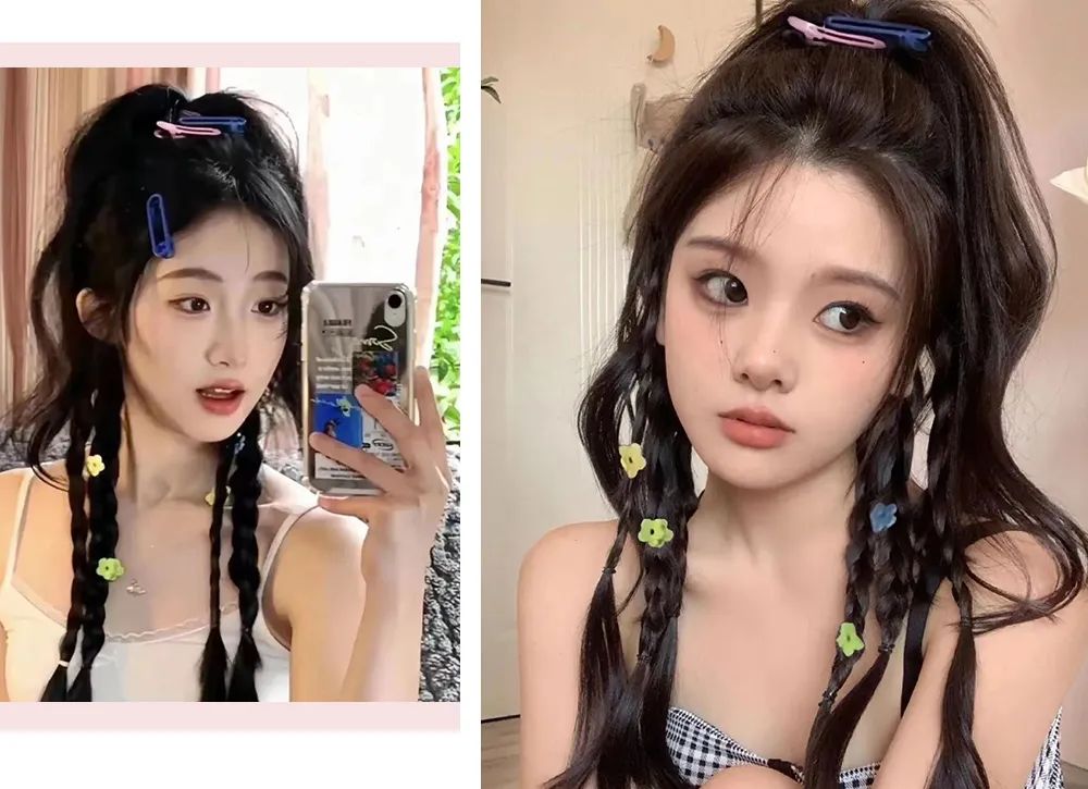 如果觉得头发不够多,完全可以用卷发棒弄卷,这样拍照一整个美住! 想要时尚度再提升一下,借用多色的发夹固定,直接变身多巴胺小公举!