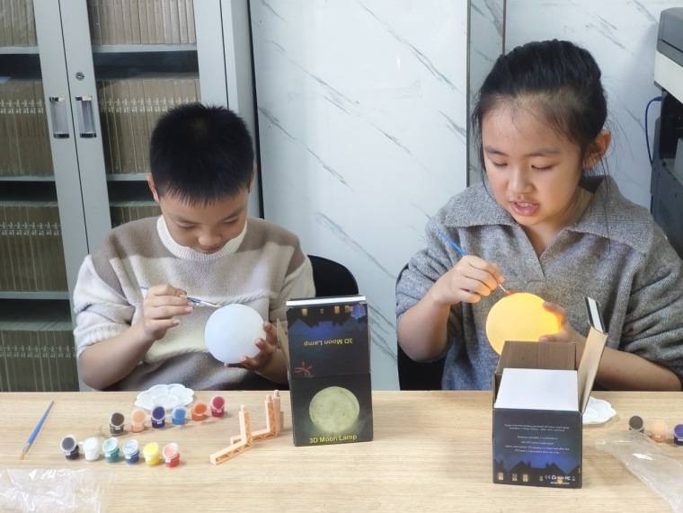 如果能把夜空中的月亮“摘”回家,放在床头、书桌或客厅里,既能当灯用,又能随时欣赏月球表面的环形山——这就是月球灯,一款把“星空浪漫”搬进日常生活的实用装饰品。由三六六社会实践精心策划的月球灯DIY手工活动,就将这份浪漫与创意送到你手中,让每个人都能亲手打造专属自己的“室内小月亮”。 月球灯 · 不止是一盏灯 它集仿真造型、柔光照明与艺术装饰于一体,无论是置于床头、书桌或客厅,都能为生活注入一抹静谧而温暖的星空诗意。 高度仿真造型:依据月球原型比例,通过3D打印成型,表面纹理凹凸有致,借助灯光透光差异,自然还原月球的“明暗面”效果。 柔和护眼照明:内置LED暖光光源,光线温柔不刺眼,适合作为夜灯、氛围灯,陪伴阅读与安眠。 居家装饰美学:简约优雅的月球造型,轻松融入各种家居风格,体现“轻装修、重装饰”的生活理念,也是摄影、静物摆设的灵感点缀。 手作体验 · 亲手绘制你的月亮 铺染底色:使用大号平头笔,将浅灰色丙烯颜料均匀涂满球体,奠定月球的基调,静待15分钟风干。 晕染暗面:参照真实月面图像,以小号笔蘸取深灰色,在“月海”区域轻柔点染,营造深浅过渡的自然阴影。 点亮高光:用白色颜料轻点环形山凸起处,提亮细节,增强立体感,让月球肌理栩栩如生。 静置完成:整体晾干30分钟后,属于你的那颗“月球”便大功告成。 把星空浪漫带进生活,从亲手制作一盏月球灯开始。 加入三六六社会实践,与我们共同感受手作的温度,点亮属于自己的一角夜空。 更多活动详情咨询:130-5280-5152